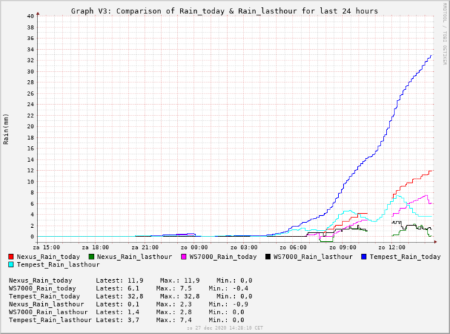 De afgelopen 2 dagen met overvloedige neerslag geeft voldoende data voor vergelijking van mijn regenmeters Nexus, WS7000 en Tempest.