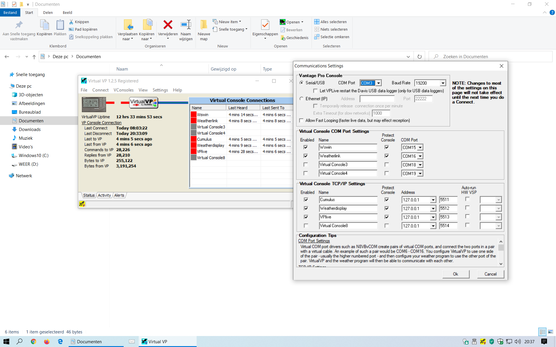 Heb daarop WeatherLink 6.0.5, VirtualVP 1.2.5.74, VSPE 0.941.5.179 en Cumulus 1.9.4 geinstalleerd.