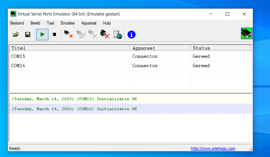 Eveneens gekochte versie Eterlogic Virtual Serial ports Emulator versie 64 bits 2.0.38