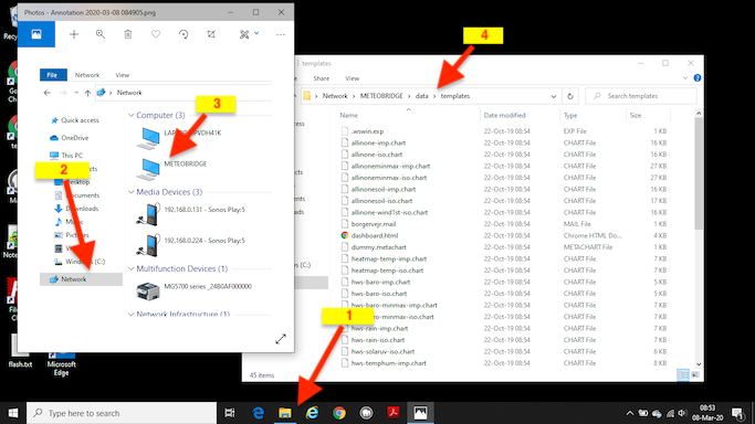 Start windows 10 -> file manager -> klik op netwerk -> klik op meteobridge -> eventueel de eerste keer meteobridge/meteobridge invoeren -> map data wordt geopend -> klik door naar de map templates.