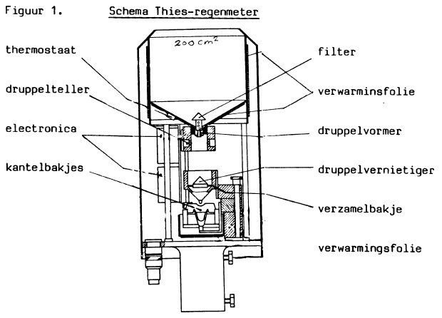 In een Hellmann Pluviograaf in het reservoir zit water en deze gaat pas leeg dat de neerslag boven de 10 mm komt, ik trek s`winters de stekker uit dit apperaat en zet deze in de schuur het kost mij veel te veel stroom 200 watt en deze pluviografen zijn ook nog slecht geisoleert en zijn 1,2 mtr hoog dus ongunstiger kan niet.