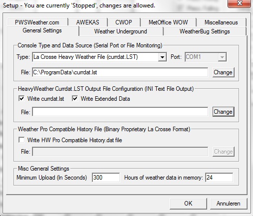 Voor mijn vrouw heb ik een La Cross HW2800i geinstalleerd en via de HW Publisher wordt die data elke minuut naar de website verstuurd. Dit is echter te beperkt en daarom heb ik WUHU geinstalleerd. WUHU leest de currdat.lst netjes uit. Nu loop ik vast bij het maken van een website. In de engelstalige handleiding staat: Enable the HeavyWeather Currdat.LST output file on the setup screen. Volgens mij houdt het in dat ik 2 checkboxen moet aanvinken en het path naar currdat.lst moet invoeren. Als ik dat laatste echter doe dan krijg ik een error (ik mag blijkbaar niet schrijven naar het currdat-bestand) en wordt er niets aangemaakt. Als ik het niet doe worden de html-bestanden ook niet aangemaakt. Ik zag dat verschillende mensen op dit forum WUHU gebruiken in combinatie met de HW2800. Kan iemand mij vertellen wat ik fout doe?