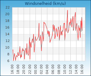 | Windsnelheid en -richting | 15.1 km/u uit ONO |