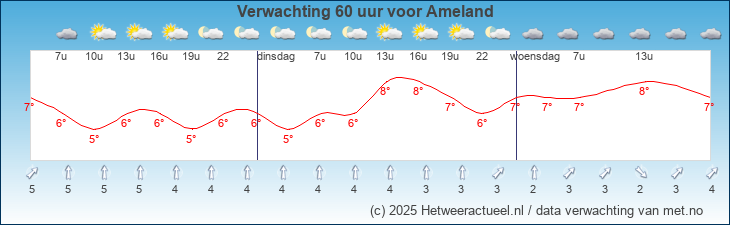 Onderstaande verwachtingen voor Ameland zijn gemaakt op basis van de XML feeds van Met.no. De ervaring leert dat deze een redelijk betrouwbaar verwachting geven.