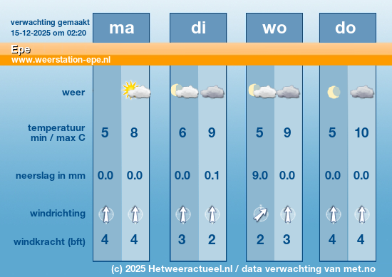 Onderstaande verwachtingen voor Epe zijn gemaakt op basis van de XML feeds van Met.no. De ervaring leert dat deze een redelijk betrouwbaar verwachting geven.
