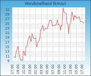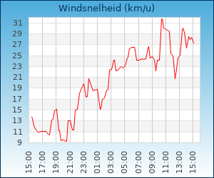 | Windsnelheid en -richting | 27.6 km/u uit ZW |