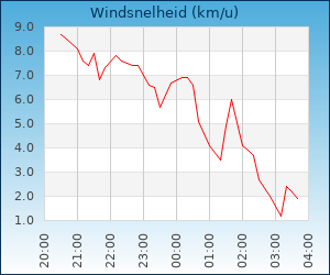 | Windsnelheid en -richting | 4.1 km/u uit ZW |