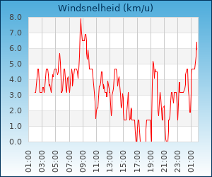 | Windsnelheid en -richting | 5.9 km/u uit NW |