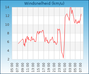 | Windsnelheid en -richting | 11.2 km/u uit WNW |