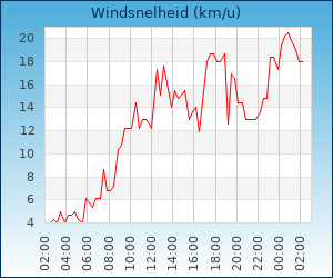 | Windsnelheid en -richting | 20.2 km/u uit W |
