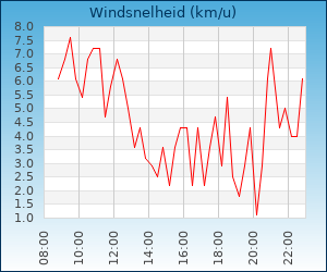 | Windsnelheid en -richting | 6.1 km/u uit NNO |