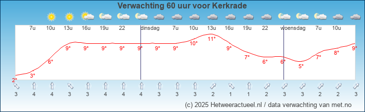 Onderstaande verwachtingen voor Kerkrade zijn gemaakt op basis van de XML feeds van Met.no. De ervaring leert dat deze een redelijk betrouwbaar verwachting geven.