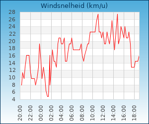 | Windsnelheid en -richting | 22.5 km/u uit W |