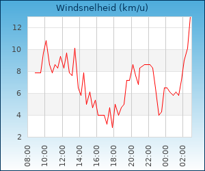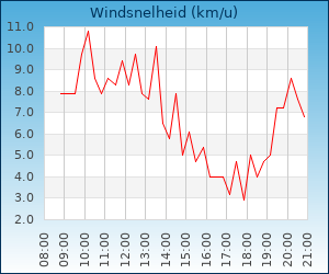 | Windsnelheid en -richting | 6.8 km/u uit ONO |