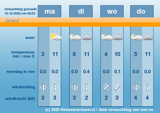 Onderstaande verwachtingen voor Sittard zijn gemaakt op basis van de XML feeds van Met.no. De ervaring leert dat deze een redelijk betrouwbaar verwachting geven.