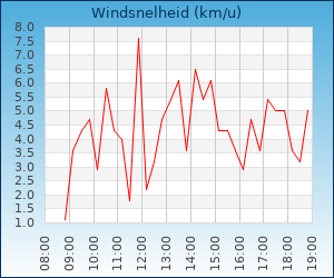 | Windsnelheid en -richting | 4.7 km/u uit NNO |