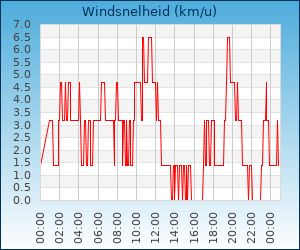| Maximale windsnelheid | 6.5 km/u om 00:08 u |