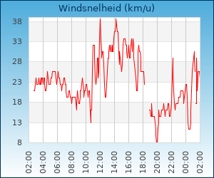| Windsnelheid en -richting | 29.0 km/u uit WNW |